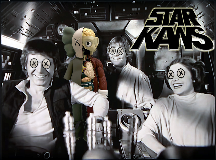 We went to see the "KAWS: What Party" show at the Brooklyn Museum and this pic is my response to the phenomenon. Former graffiti artist, Brian Donnelly, aka: KAWS, has made a career of appropriating global commercial entertainment tropes into his personal brand (his big breakthrough came 20 years ago when he subsumed The Simpsons). The photo of the eviscerated Companion is by me, as is the logo. I realize that by posting this, I am KAWSing his brand to spread even moreso. Hey, if you can't beat 'em…