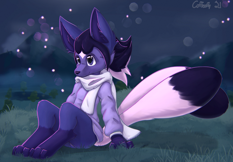 of their fox in a cozy sweater and scarf, surrounded by pink fireflies~
