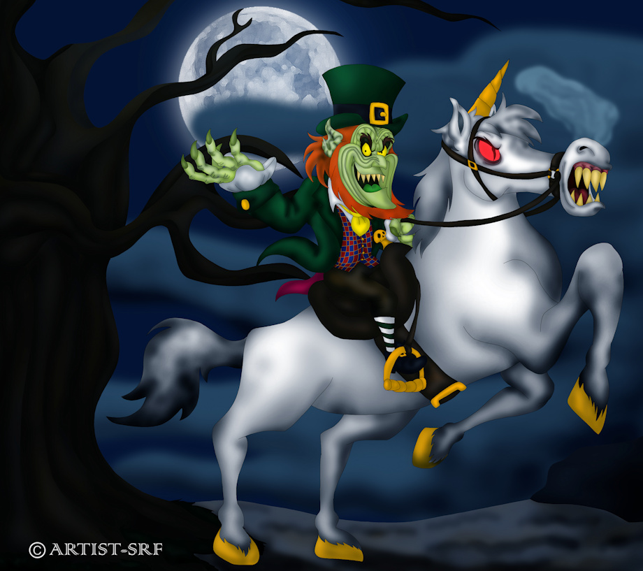 I've seen a recent Lucky Charms commercial where the cereal mascot rides a unicorn to escape the usual kid characters. Then I remembered the messed-up, yet hilarious Demon Unicorn Ani-motion Mask commercial from Spirit Halloween, so I decided to make that Lubdan the Leprechaun's steed, only pony sized.