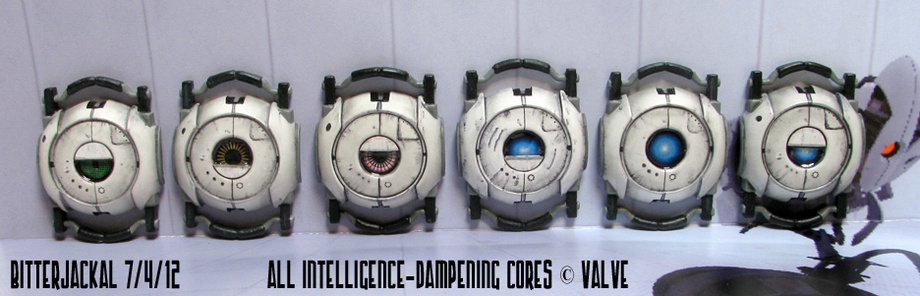 Each piece is a polyurethane resin blank from a mold based off a handmade sculpt by myself (again, forth from left is original sculpt). Primed and hand painted with Model Master enamel. Grunge is via some Prismacolor markers. Three small decals on each piece for the weathered sticker, metal port, and Aperture logo. Tri-coat matte finish over the entire piece and an acrylic clearcoat over the inkjet-decal eyeball. These are made to stand daily wear and tear but will chip if you get rough with them. The resin itself fairly resilient, BUT the handles are fragile and can break if dropped from shoulder height, so please be careful that you have secured your core. Much like Wheately, they do not like falling from high places. If worn as a necklace, please be mindful of seatbelts, birds, nanobot supervisors and other things that may apply stress to the core.