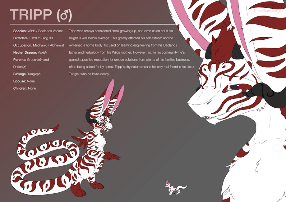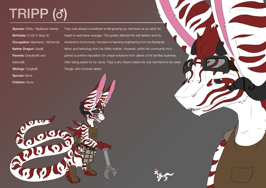 Ref sheet of my Venkat, Tripp, who is an Alchemist and a Mechanic even though he is rather clumsy when he is not working.