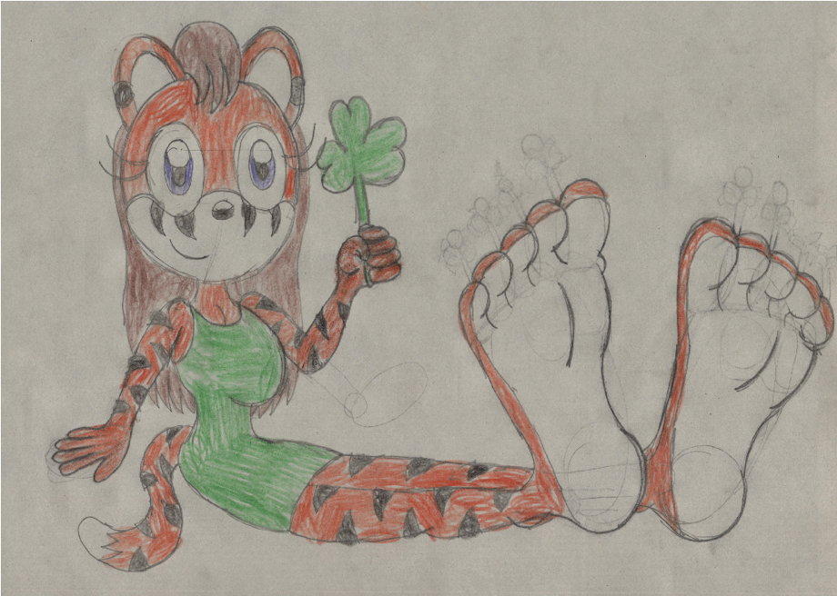 For St. Patrick's Day, I drew a foot tease pic of my gal Liea the Tigress wearing a green dress and holding a shamrock.