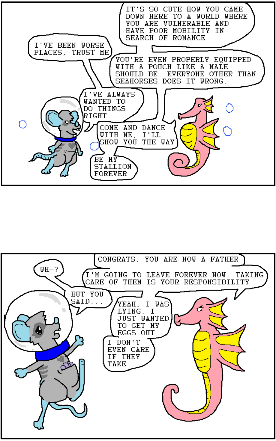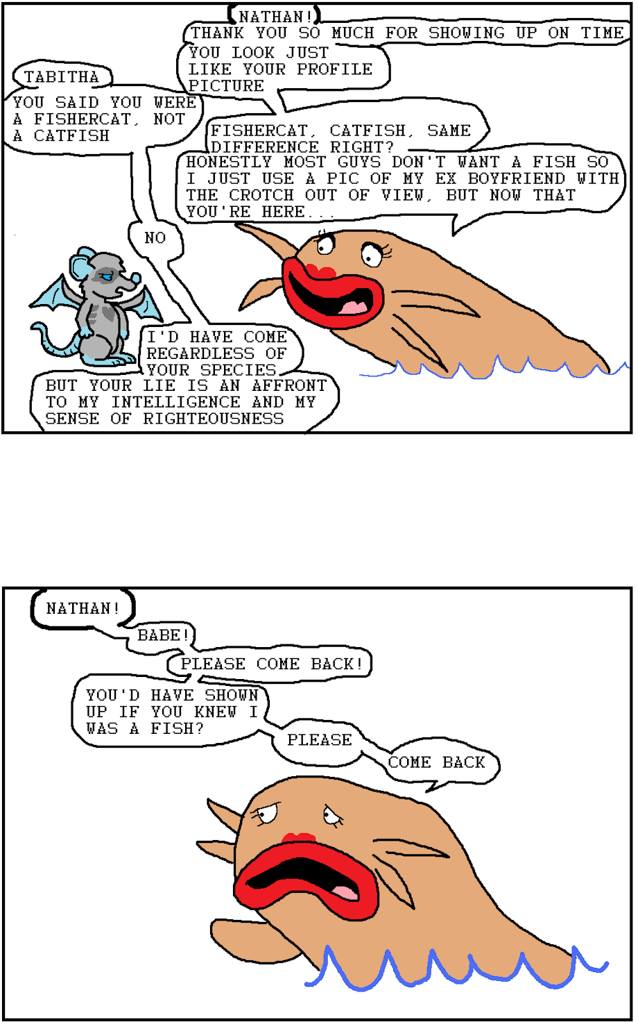 Don't you hate it when someone on a dating site claims to be a fit and somewhat masculine (still female) fishercat, but instead of a nice fluffy mustelid you get a floppy catfish? And then it turns out the photo was a lie and it wasn't even a female fishercat photo she was using to lead you on, but a male.