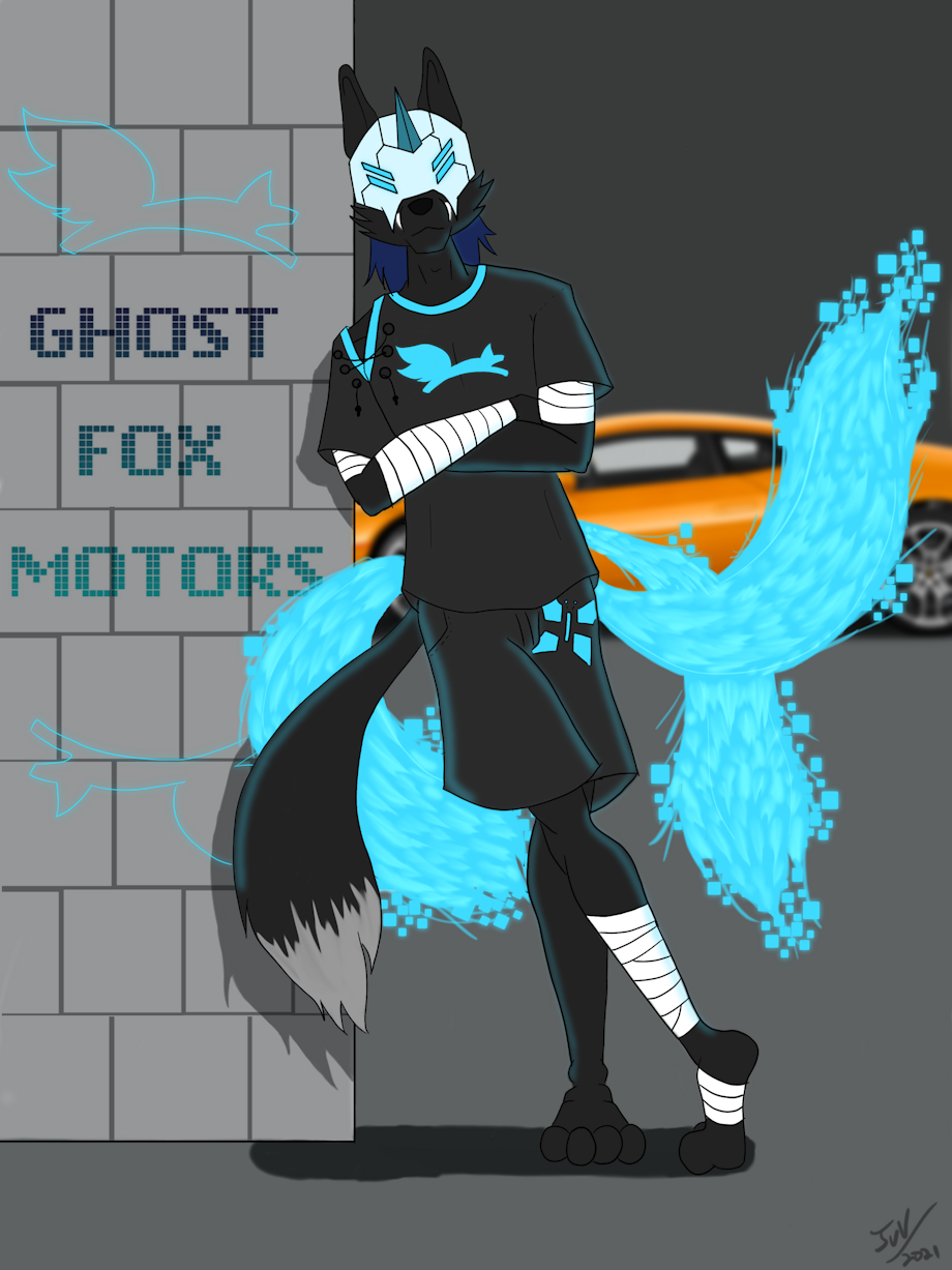 I never draw Godwin's son, Kirin. He's a kitsune. Those tails are the most ambitious thing I've done in a long time and I'm so proud of them. Kirin is a mechanic (read: technomancer). That in mind, I had this idea of "pixel fire". It occurred to me just the other day that his aesthetic is "lazy cyberhunter". His helmet is a mix of Raven Branwen from RWBY and Cayde-6 from Destiny