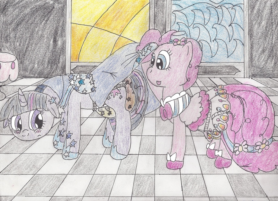 "Oh, you won't be embarrassed, Twi! Just watch me!" Tears off her dress to reveal her own diaper. "HEY EVERYPONY! LOOK AT MEEE! :D"