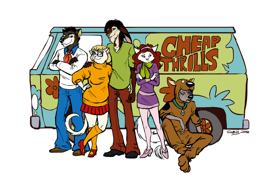 Jeordie doesn't have to change too much in order to look like Shaggy, haha. Originally I drew Jeordie with his regular curly hair, but then it didn't look like he was wearing a costume - it was just him in brown pants. I decided to keep Erik's hair the same as it usually is...he looks gay enough in those clothes without throwing Fred's hair into the mix, lol. Bethany's van is of course playing the part of the Mystery Machine :)