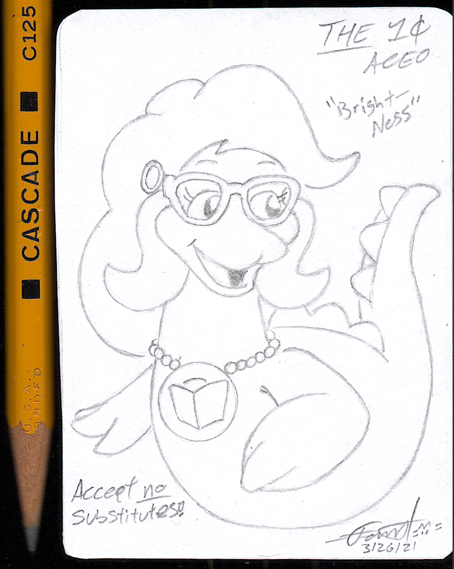I had to play with proportions a bit in order to fit Dr. Rabbit on this ACO ...consequently, I don't care very much for this card, but I didn't want to draw the character again today. Why? I made seven practice sketches, most of which had good line art, but didn't fit the dimensions of ACO. Eventually, I lost interest in creativity and just redrew this stock image of the character. (I've been drawing 'bigger' lately; no idea why). :p