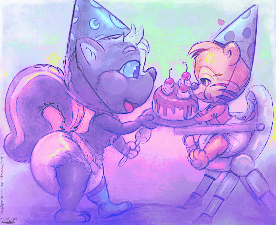 Who wanted to give his fellow baby-buddy a nice treat for his birthday. When did baby Ozzie learn to bake a cake? He must be magic. ;^vv^