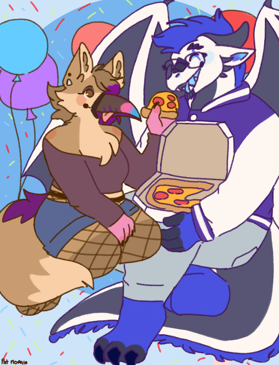 I wish you all the happiness and lots of pepperoni pizza! 🍕 Thankies a lot, you big handsome dragon, for bringing joy into my life! 💕 I commissioned this beautiful art from Pat Morais! Thank you so much for this lovely commission 💜 It's me and Exano in this mega cute drawing ^v^