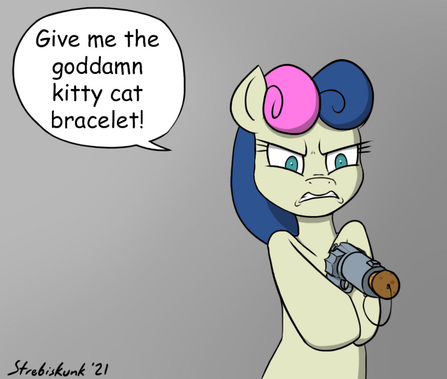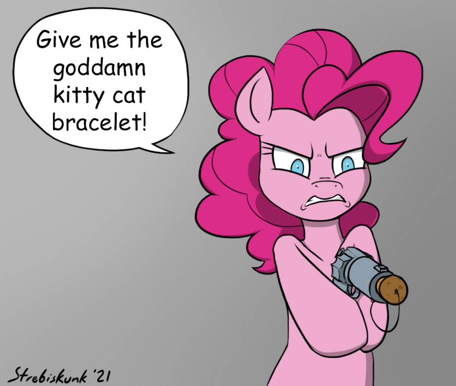 Inspired by the movie Nobody, which I really enjoyed, and couldn’t help imagining Pinkie saying this line. Also included a Bon Bon version, since she actually fits the character from the movie better (in this version, I imagine the bracelet belongs to Lyra).