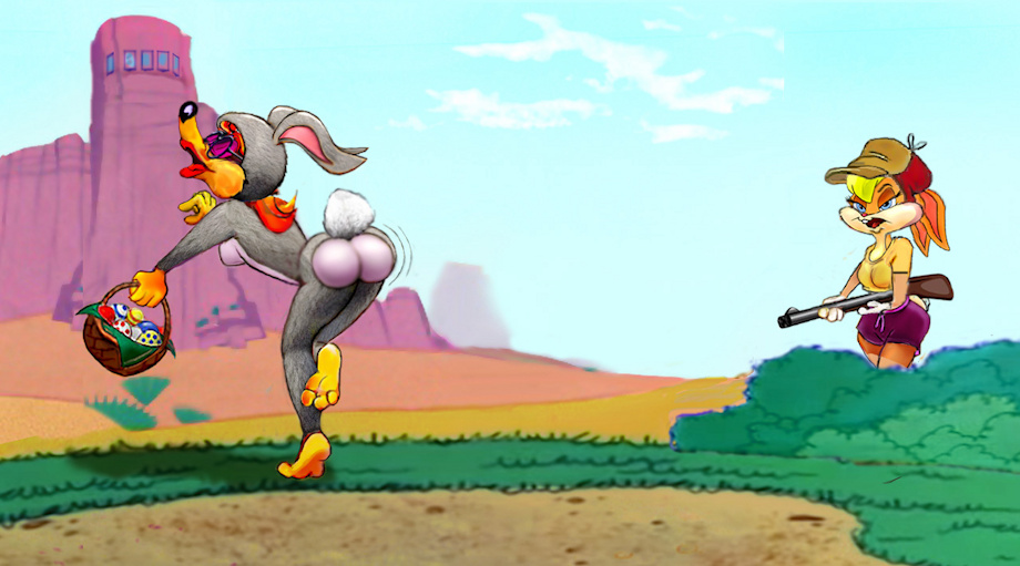 Lola seems to be thinking: Thank you for making this EASY. The inspiration came from a Comment made by my longtime friend FraggsterFlythe3rd who suggested that Lola; already under a lot of stress and seeing Dottie usurp her role as an Easter bunny; would channel her inner Fudd and go on an Easter egg hunt of her own. Guns and buns—it wouldn't be Easter without 'em.