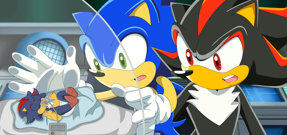 Felt like editing a screenshot and turning it into the moment that Sonic and Shadow found Sokudo within Eggman's lair :3