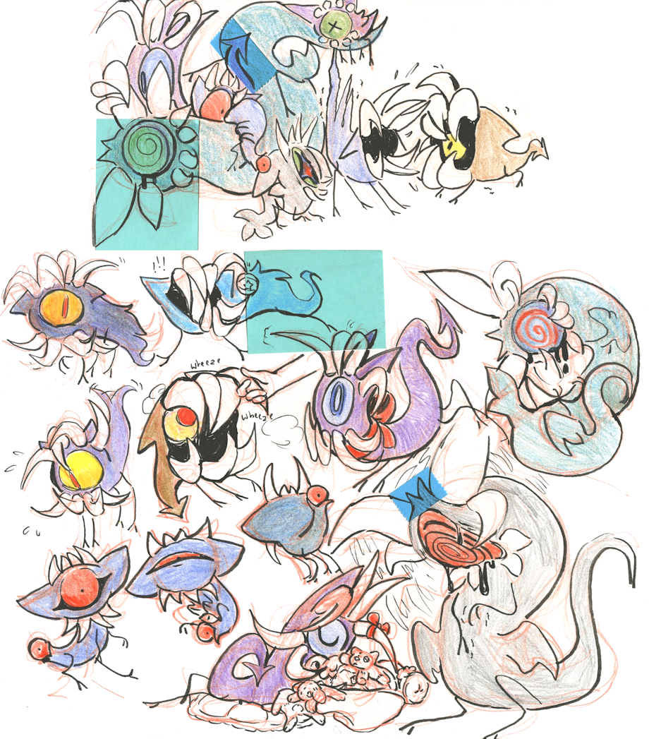 traditional sketch comm of someone's OCs, rocket & beep! rocket is a villainous and beep is her beleaguered rabbit sidekick. they care about one another very much, though