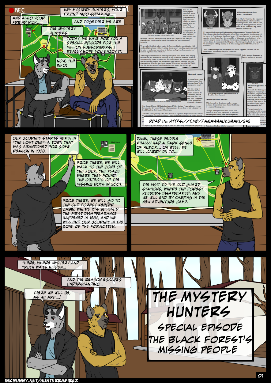This is the first page of a comic that HunterRamirez is drawing for a user named DasherWhitetail. It's basically a prequel to the "Your Mistake" comic that I commissioned him to draw for me. My demon fox fursona is a guest in this comic. The comic follows my demon fox fursona, Nick, and a hyena character of DasherWhitetail's named Nicholas (Nico) as they report for a newspaper about the disappearances of people in a forest.