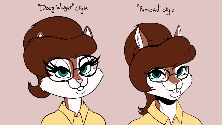 A little experiment between two commissions, trying to mimic Winger's style for fun. Used -that- squirrel as a model...You know the one. Two versions for contrast with how I'd draw her normally.