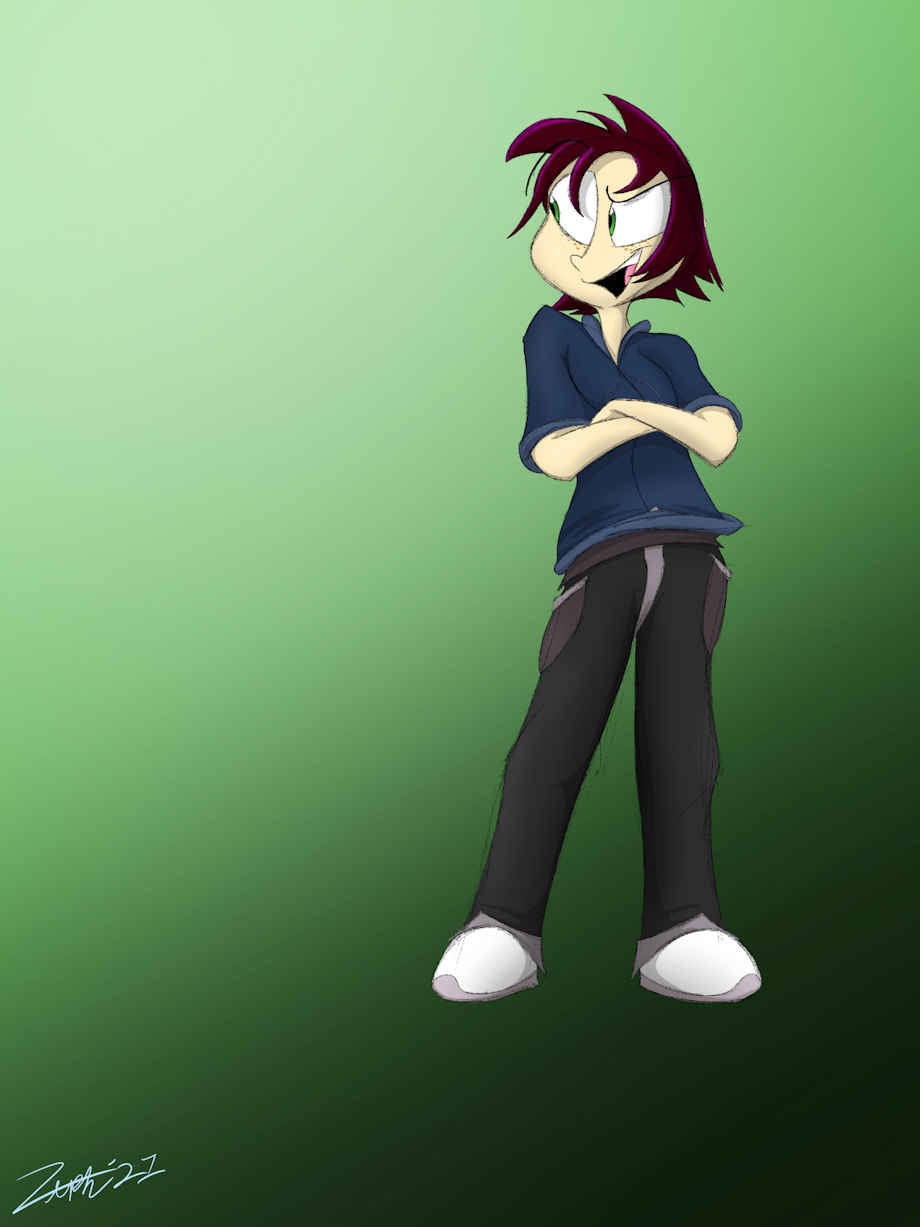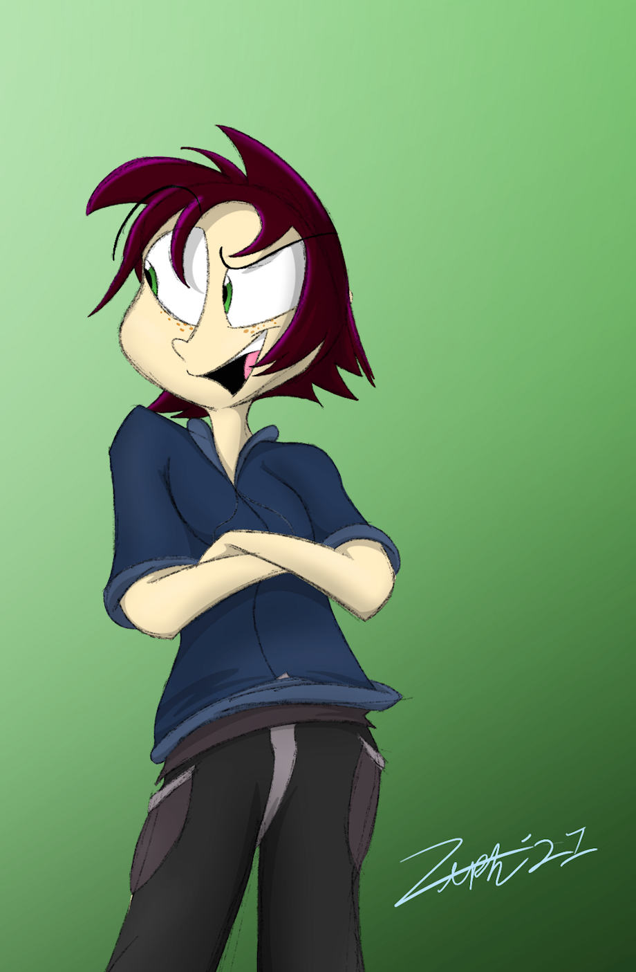 So I proposed a solution to my fren -- have a similarly aged human char follow the main cast around, and to maintain connection, make them a child of Cameron's. We settled on a female, then I got bored one day and decided to actually draw her out.