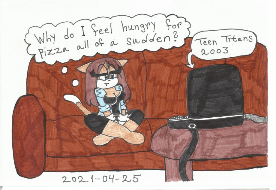 I've been watching the original Teen Titans cartoon show form 2003 in my laptop lately, and sometimes everytime I watched it I was like "Dude, why do I feel hungry for pizza all of a sudden?". Well, the scenes with the Titans hanging out for pizza made me feel hungry for that.