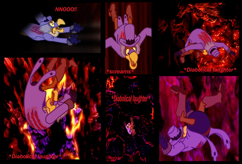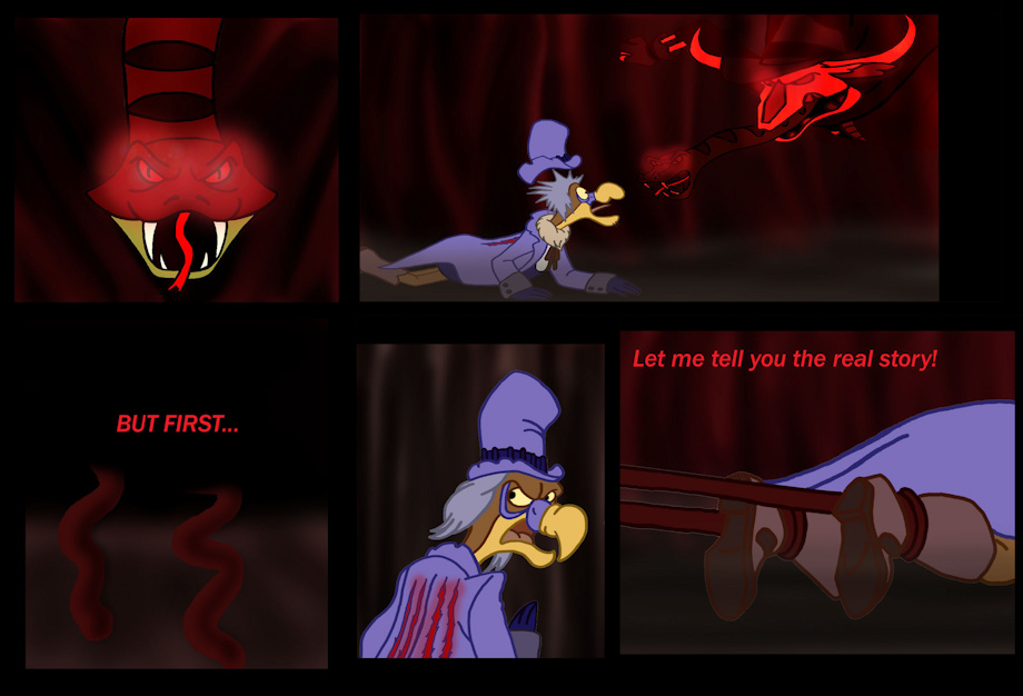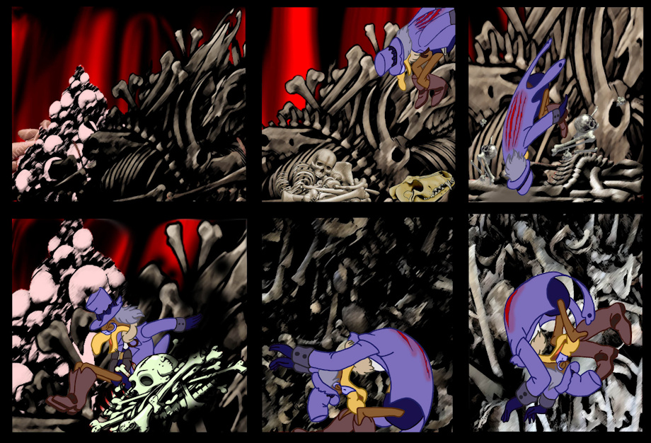 Continuing from the last page, Boot Hill gets dragged into the darkness behind him by mysterious vines that soon release him to where he starts screaming in terror at everything all around him, while Skull Duggery unleashes diabolical, mocking laughter the deeper and further he falls into the abyss where it almost looks like he is about to enter a vortex leading to Hell. Suppose by the possible theory that Skull Mountain was not only haunted by Skull Duggery, but somewhere deep in the mines, it held a portal to Hell far deeper than anyone can imagine. If that is true, then anyone who entered Skull Mountain was already under the spell and influence of greed and lust for all the silver that Skull Duggery protected, and even if someone did succeed in taking one bag and walked out of there, they'd be haunted and tormented by Duggery's vengeful spirit until they met a grim demise. So anyone that never made it out of Skull Mountain became part of Duggery's bone collection, wherever that is, while their souls can never escape as they are imprisoned below. Now if only the show lasted one more season and it would be cool if they released a five part episode titled "The Curse of Skull Duggery" which would prove that there is more to the legend than anyone thought, and a curse that comes with it.