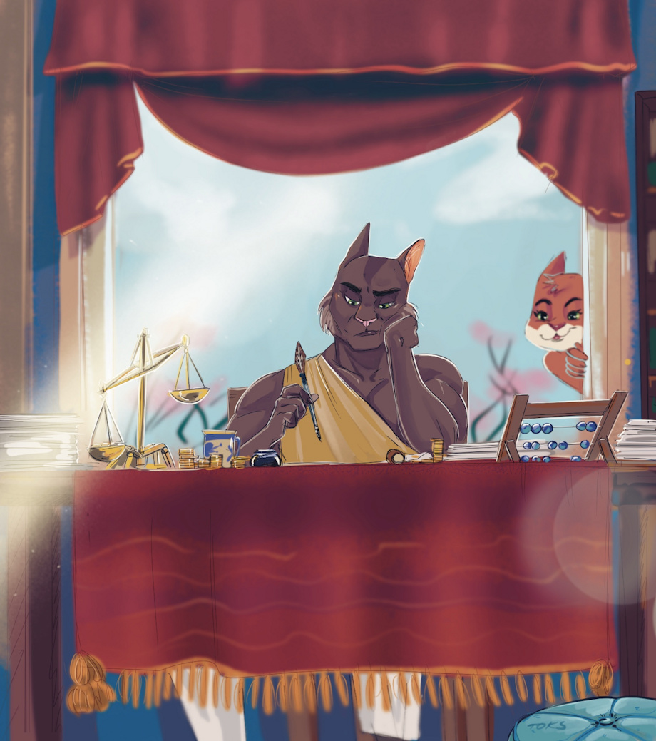 Shameen does not involve himself much in the day-to-day business of the inn. But he does manage the finances because Shema has a habit of "losing" money while counting it. Looks like she is getting ready for a raid on the inn's coffers.