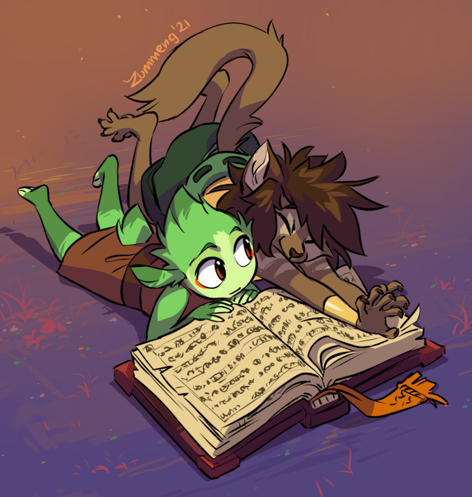 This picture was made to show how good friends they are, and to show how different they are in some manners. While Chili can calmly sit and read a book, Mira can't sit on her butt for five minutes :D They will be really good friends in the main story, and little scenes like this can really show the small differences between the characters personalities :)