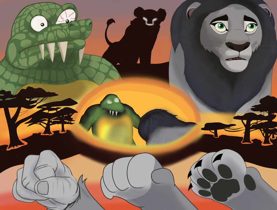 A roar erupted across the clearing, but the shadowy trees hid its source. With a thud, a massive lion leapt before the kremling intruder.