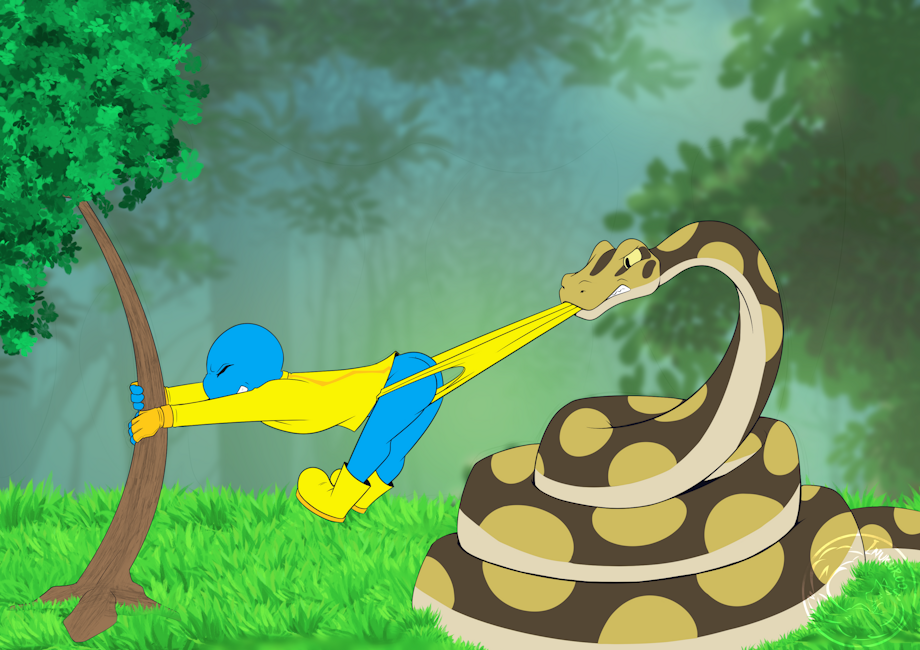 the environmental surroundings of the jungle, but the Morphling wants to have some fun instead. So he grabs a nearby tree as the python pulls on his pants...
