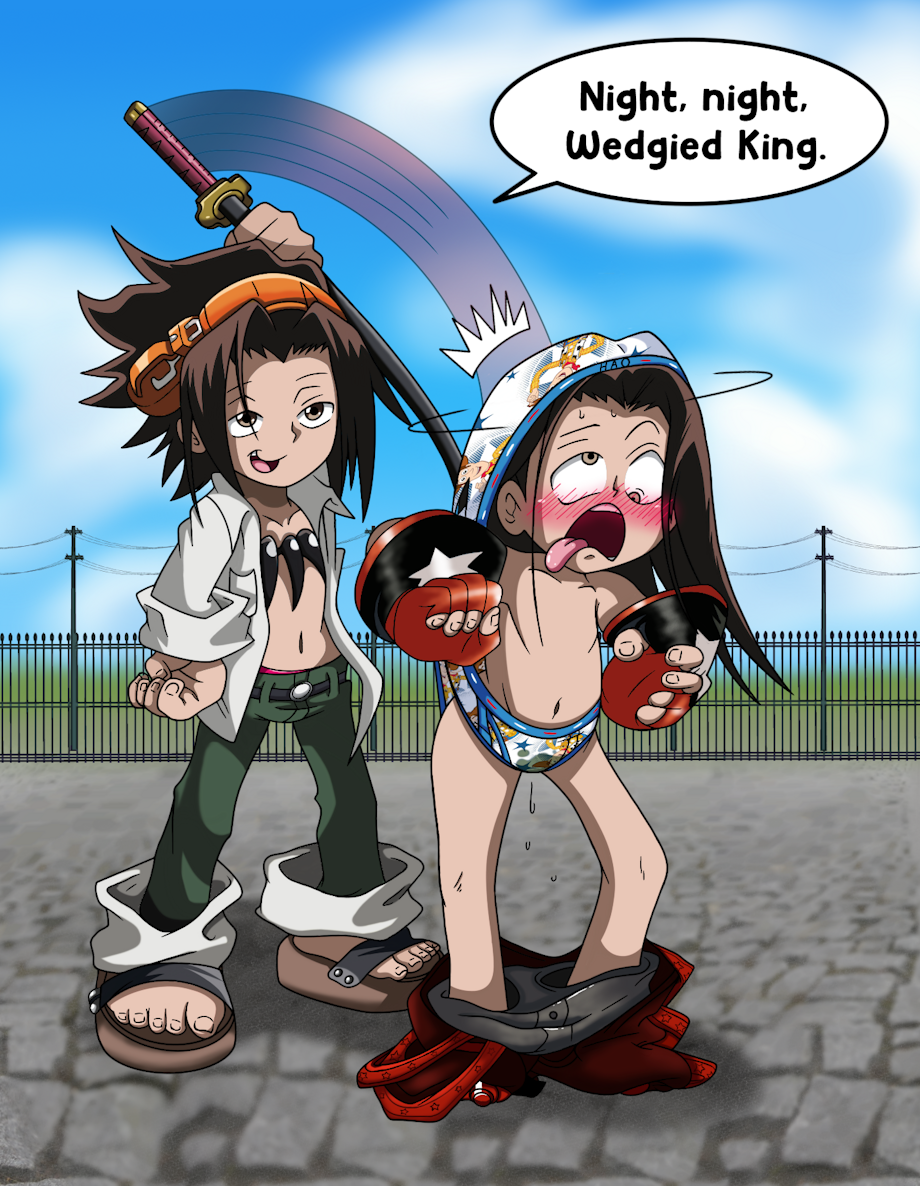 Yoh knocks out Hao after a Shamon fight. He's been pantsed and given a strong atomic wedgie that derped the hell out of his mind. The sudden pain has him even wet his baby Toy Story briefs too. He's been unrelentlingly humiliated for Ioh's amusment. One could say the coolness factor has dropped, much like his pants.
