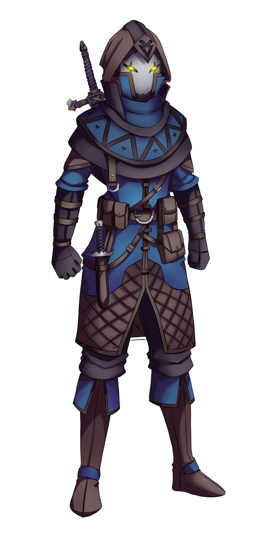 Appearance: Wears a Silver Mask with Glowing Green Eyes. Wears a set of Dark and Silver Steel armor, Equipped with a dark-purple cloak and skirt with torn edging.