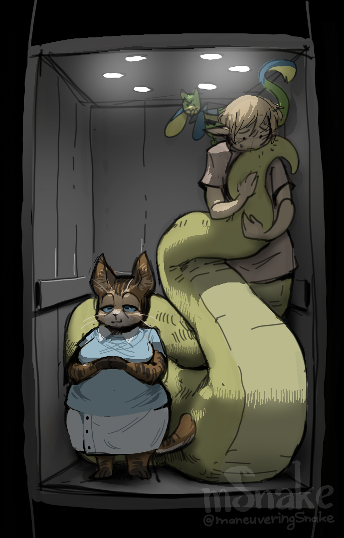 Our noodle here wish he was so small right now. But he's effort to make space for her in this elevator is still appreciated.