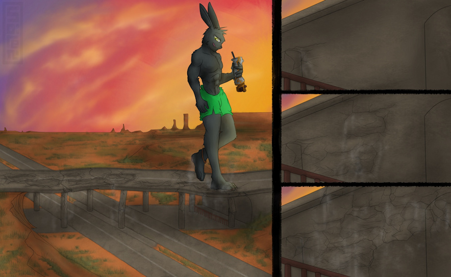 Commission for Krighsu! Featuring my bunny Caeleb taking a stroll through the desert. ...with some minor consequences for the local infrastructure.