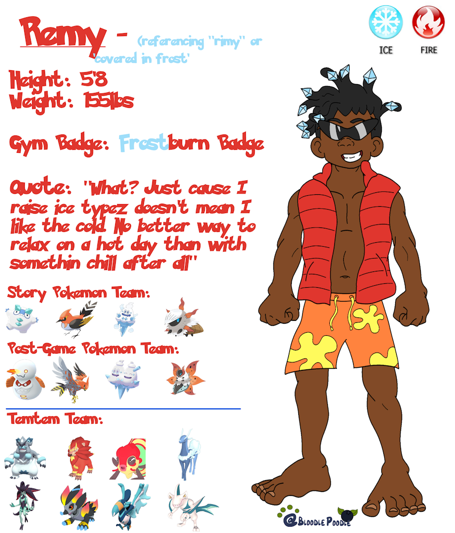 It's time to unveil my new Pokemon Gym Leader/Temtem Dojo Leader oc! His name is Remy and he's a super chill beach bum with a fiery passion for battling 🔥❄️
