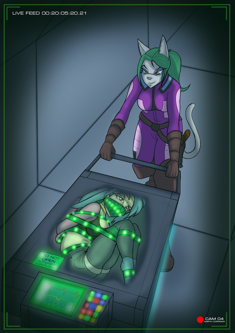 Bounty hunter Tessa Young smiled to herself as she pushed the hovering stasis crate to the hanger where her ship, the Ishtar, was waiting. Galactic Sentinels, even junior ones like Virgil, often had prices on their heads from the criminal organisations they foiled across the galaxy. Her contract was one such bounty, but the feline mercenary’s scheme was much cleverer than that: As usual, Tessa would avoid the Longbow fast travel stations to keep a low profile. The extra travel time would allow her to spend some quality moments with her cute, helpless captive. But no doubt it would also give Virgil’s team at the Sentinels time to notice her disappearance and put together a rescue mission. Tessa would deliver her prisoner to the crime lords that wanted to enslave her as revenge for having ruined one of their operations, get her payment and then Virgil would be rescued by her friends before any harm could be done. Easy, guiltless, and profitable fun. For now, the kinky cat was mostly looking forward to a private week in the silence of space, with her kidnapped damsel along for the ride…