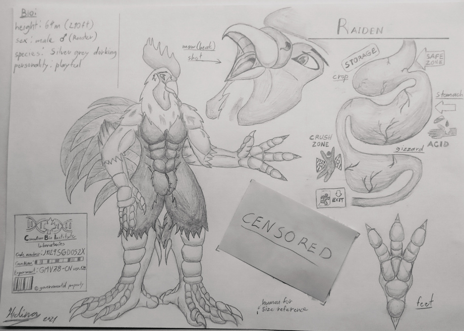Backstory: "After leaks of the "incident" with Sedmikráska surfaced to government eyes, some foreign countries went ahead with some projects of their own, to help support the cause. One such case was in a lab in Canada where scientists used a modification of the serum to test out an anthropomorphic version of Sedmikráska: a humanoid hybrid of animal and human. While it proved to be a success, there was a major side effect; some of the gene activators for size shifting stayed in the substance. More specifically, the growth portion. After a few months, the rooster, then named "Raiden", had grown so huge that he once reached his peak height of 64 metres. Given such a case, he went out into the wild areas because he would be too big to be contained."