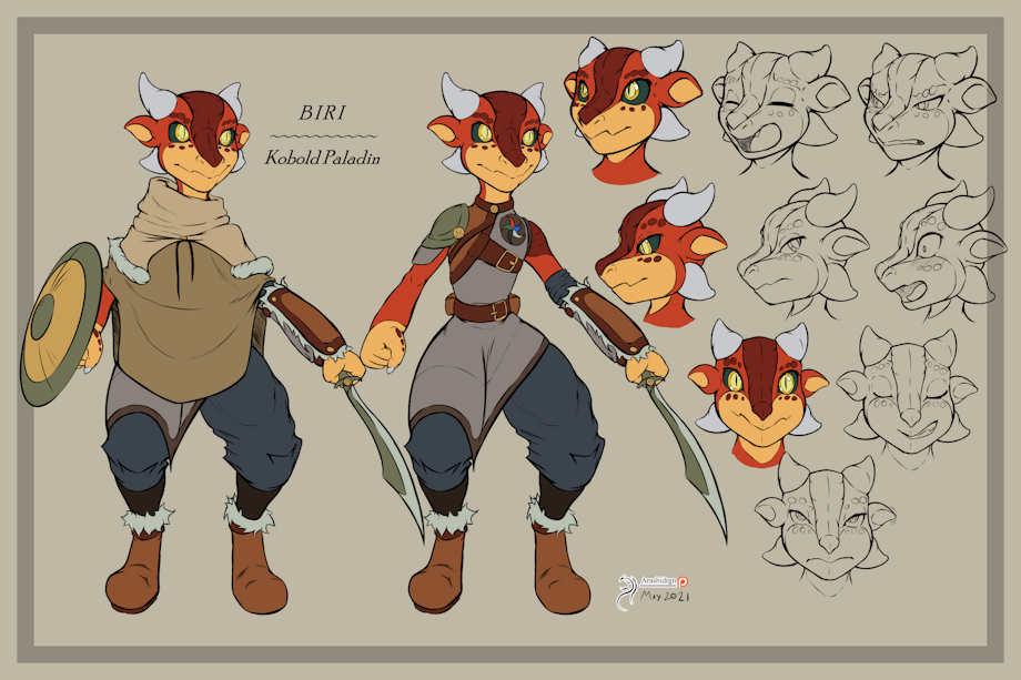 Simple design sheet for Biri, I work on these during D&D nights. My original plan for her was after lvl 3 where she had fancy armor and magical powers, but this new campaign started at lvl 1 so I did a rework with cheap-o leather armor.