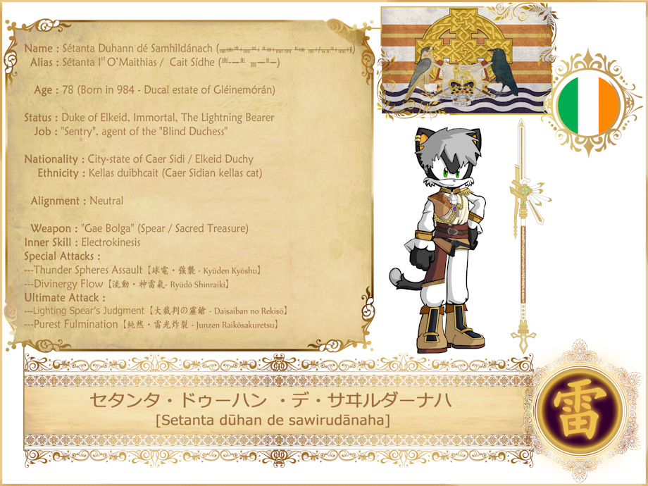 Setenta is the owner of one of the Divine Skill, the control over the electric currents. Bassically acting like lightning magic, Setenta can use it to create and summon lighting, thunderbolt and even heal himself trough reiki.