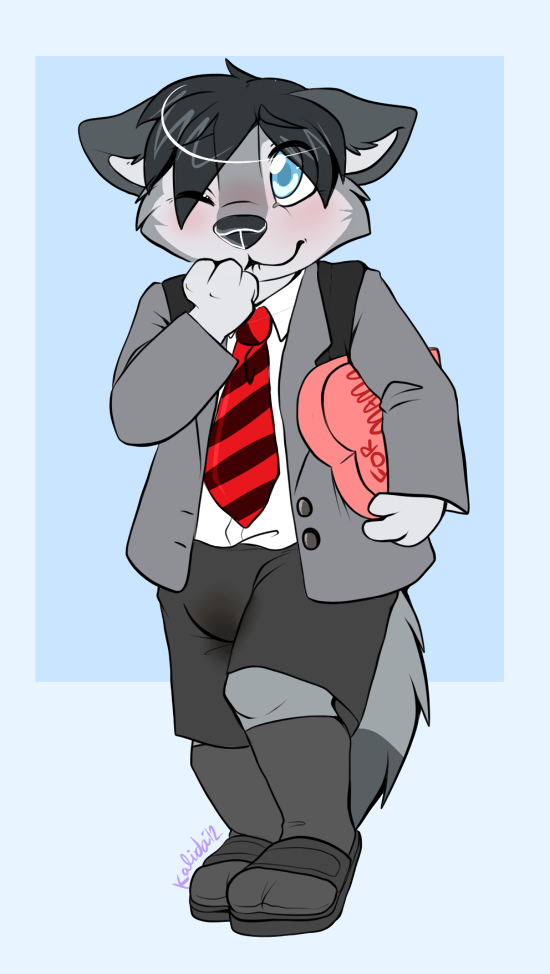 Loupy wearing age-appropriate clothing (he is 5 years old after all) but acting like the baby he is while going to give some chocolates to a certain kitty-doggy named Fiona.