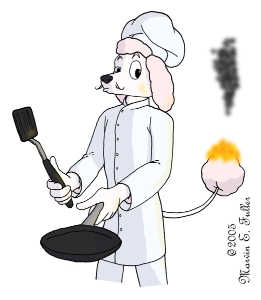 I've occasionally noodled about with the idea of redoing this piece so it can be painted onto trivets for sale to people, sort of like expensive (yet useful in the kitchen) prints. Other pictures would have to be drawn up so this wouldn't be the only one floating around if this idea takes off. (For example, the poodle chef stares stoically up at two slices of toast embedded in the ceiling over a toaster.) Plus, I'd also have to be motivated enough to want to deal with people and get them to want to buy the things. :(