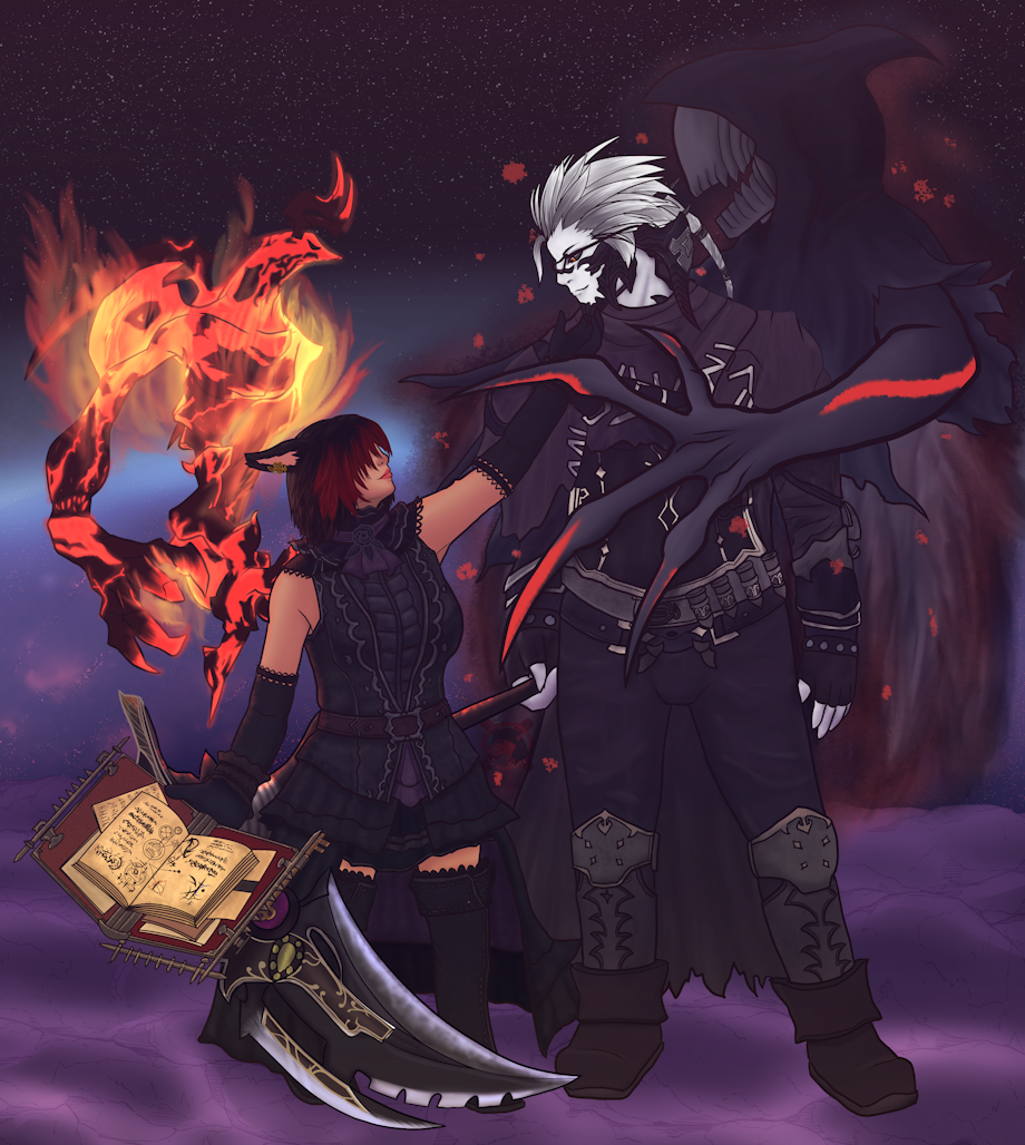 Belle and Ravana Grim in their respective jobs for FFXIV Endwalker.