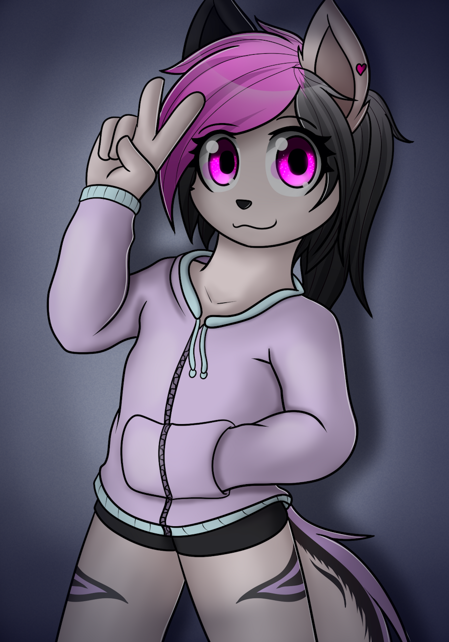 she's very cute ^^ I like her fur patterns, and the heart earring is a very nice touch. personality seems either a lil carefree or naughty, given the short shorts and lack of a shirt under that hoodie.