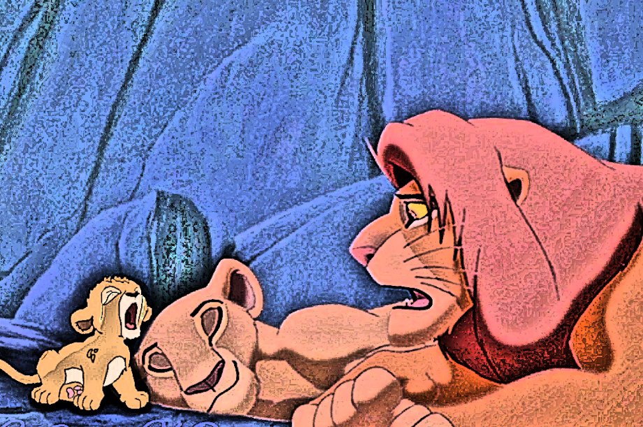 Simba is startled by Kiara crying who is hungry. So he tries to wake up Nala so she can feed the crying cub, but Nala is fast asleep so Simba gently picks up his precious baby cub and places her near Nala’s tummy and Kiara begins to suckle milk from Nala’s teats. Simba, Nala, and Kiara are owned by Disney.