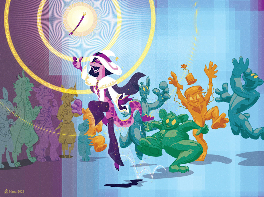 Her crystal wand traces through the air like a sewing needle breaching and submerging in fabric. With but a touch, the customers in the mall began to inflate and bounce. Minds melting into balloons. Waves of magical energy did not contain themselves to a singular person. As the grays and eggshell whites of the predictable verticality of the walls bent and exploded in bursts of jovial colors. The Security guards turned to grinning windup soldiers. Outlining the path of the parade. A feline struggling to hide behind a wishing fountain turned gold, and chittered like an old animatronic.