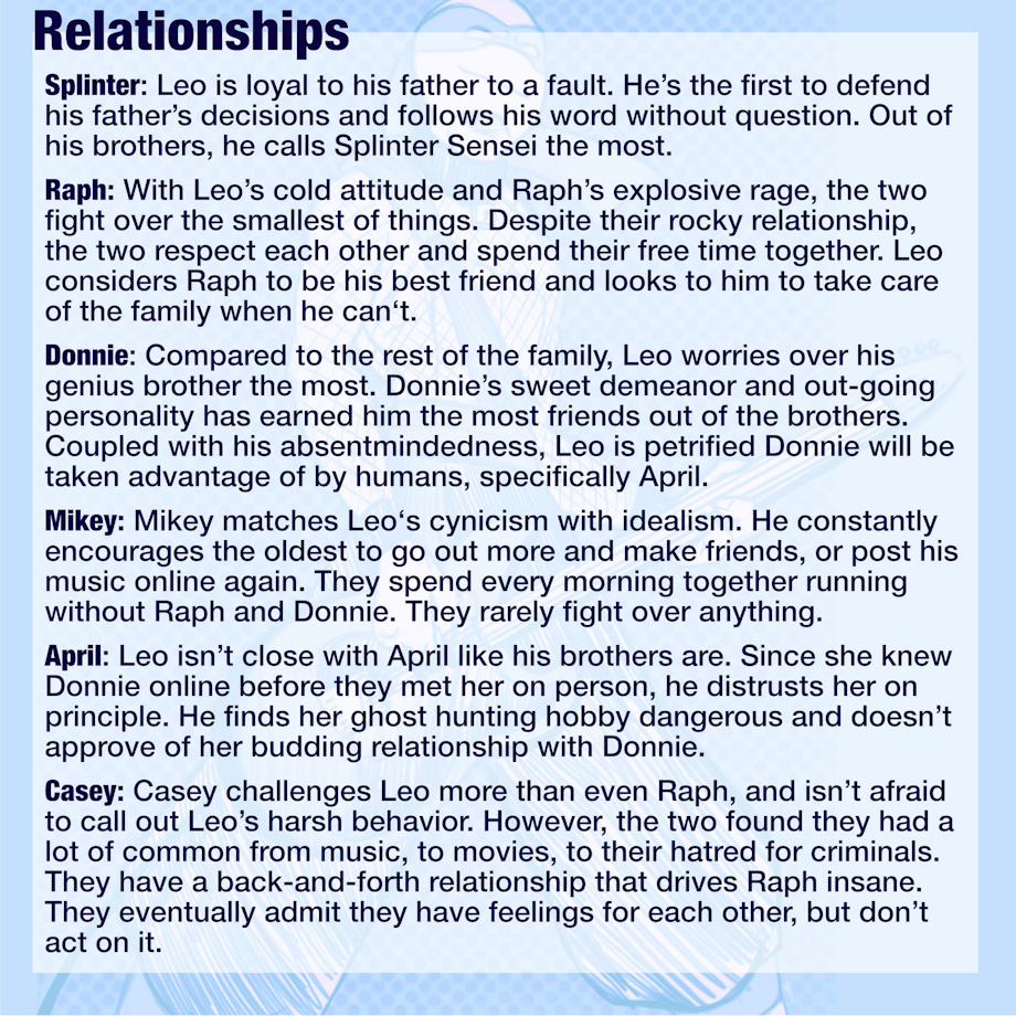 So I’m constructing a TMNT au that’s called Legacy. This is my first of the character sheets I’m doing. I’m going to do Raph’s next.