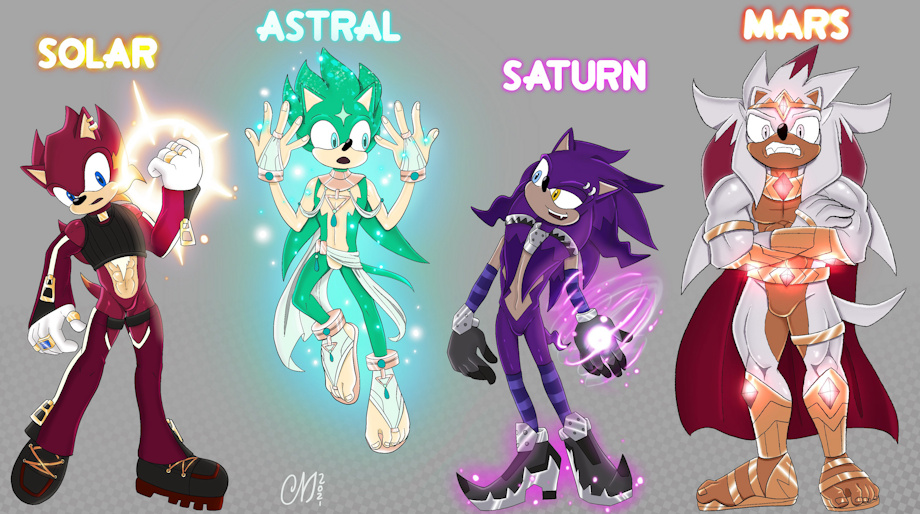 ANYWAY, here's my bois! A family of Hedgehogs that come from a space colony far from Mobius. The leader and Father of the three brothers is Mars on the right there, followed by eldest brother Saturn, youngest brother Astral, and middle brother Solar.