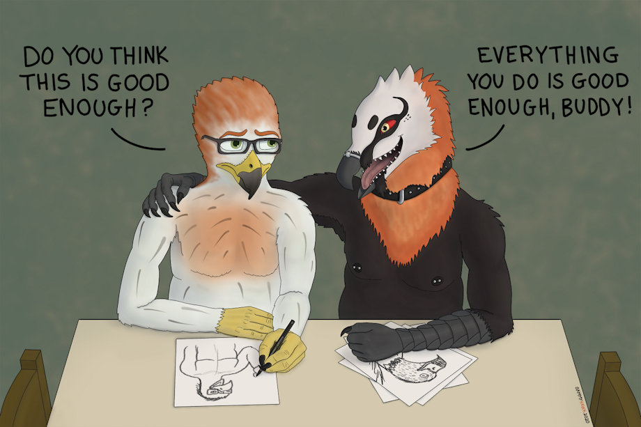 Sammy is a very insecure bird. He is always afraid of not reaching his adopted big brother Magnus standards. Magnus is a great artist, and he has been teaching Sammy for a while. Magnus is not only a tutor in art but in life itself. He teaches Sammy how to gain self-confidence. I just love their dynamic.