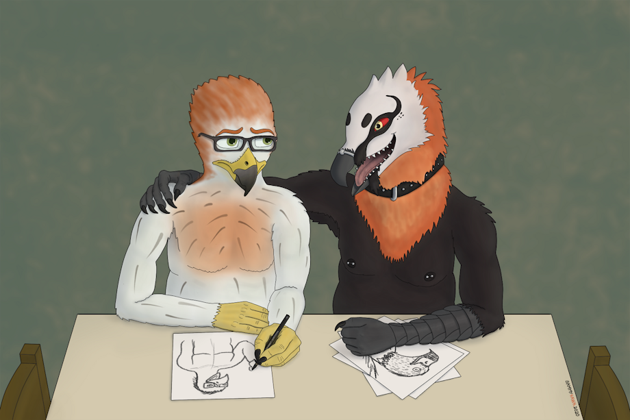 The pic Sammy is drawing is a trace of a quick sketch I did the first day I tried drawing with a tablet. The eagle below Magnus' hand is a pic I drew about 8 years ago when I tried to be an artist for the first time. I was alone and without any experience. It took me about 2 months and 5 pics to give up, and never touched a pencil until November last year shortly after I actively joined the fandom.