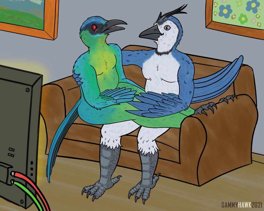 My request for legguchan. He wanted a cute gay couple between a lesson's motmot (Momotus lessonii) and a white throated magpie-jay (Calocitta formosa).