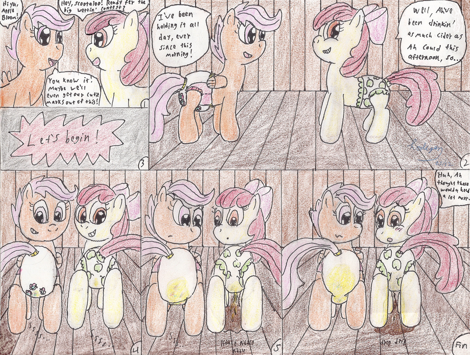 "Hey, Scootaloo, ready fer the big wettin' contest?"