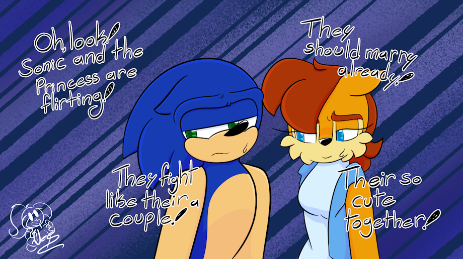 Sonic and Sally are not dating they bicker about how to handle certain situations, they mess around and play pranks on each other, they make fun each other, but they hold no feelings for the one another. But for people and citizens around them can't help but "ship" them together and make it awkward for the two. Sally knows Sonic's dating Ash, and Sonic knows that Sally solely wants to focus on getting her dad back and restoring the kingdom, so that leaves her little time to focus on love, but just enough to care for her friends and people.