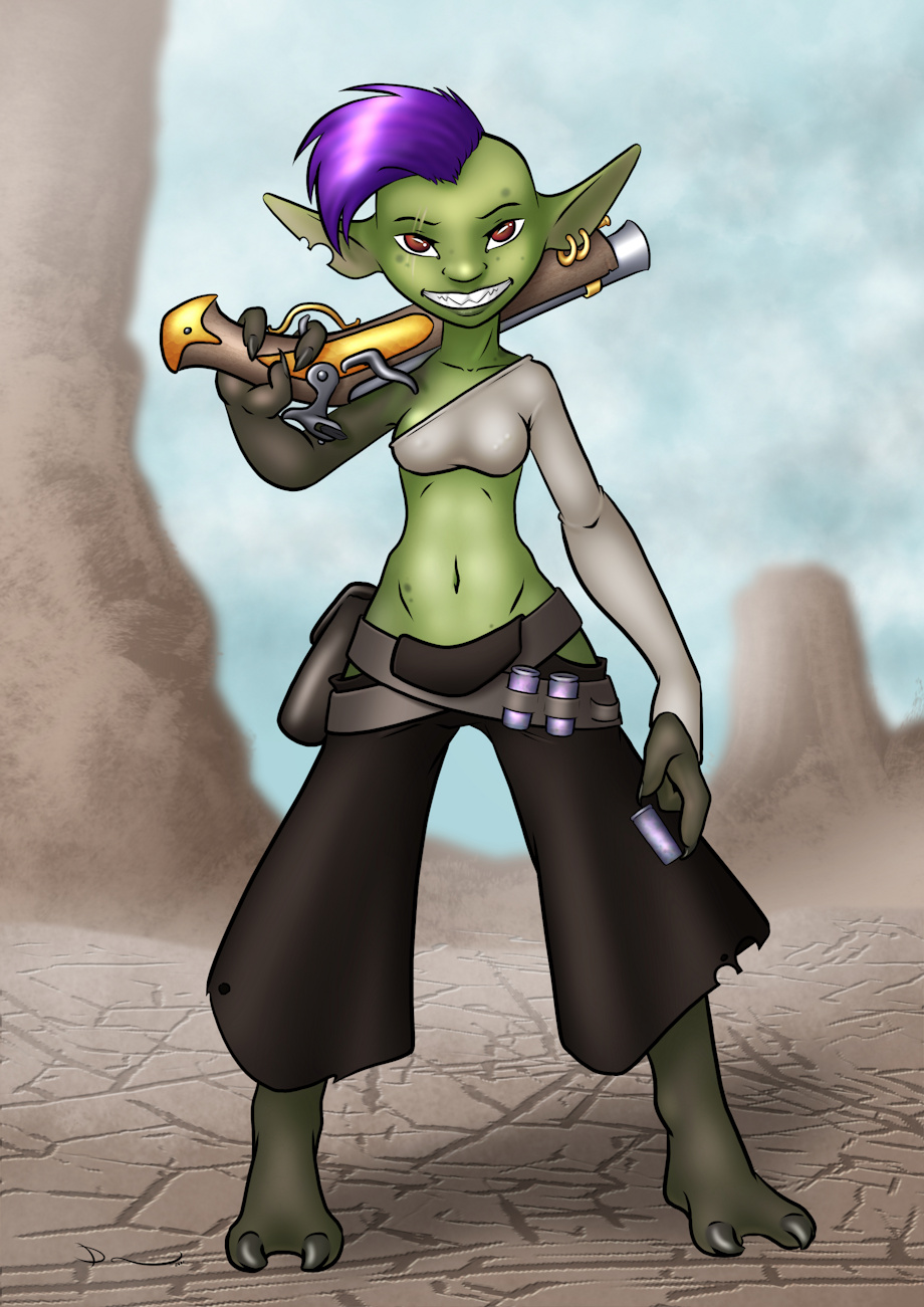 So about two years ago I drew my goblin gun chemist. I decided to redraw her. I will admit that her hands and feet are borrowed directly from how InCase has been drawing goblins for the comic Alfie ( https://buttsmithy.com/ ).