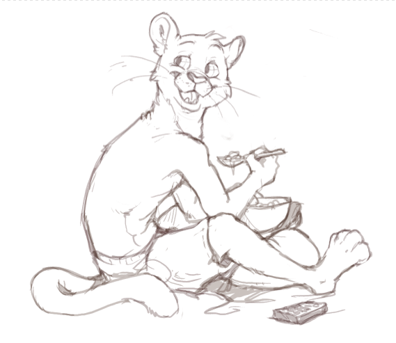 In the extra sketches you see how the drawing progressed. In the first one he's watching TV. I loved it a lot! But I was greedy and wanted to see his cute face better, so I told her 'make him have his head turned', and she took me so literally that she did it so he's still paying attention to TV while responding xD It's a very cute one too, but I asked her to let him be more placid, like... 'oooh, sure, I'll go, there's no rush in life', and she caught that feeling great in this expression.